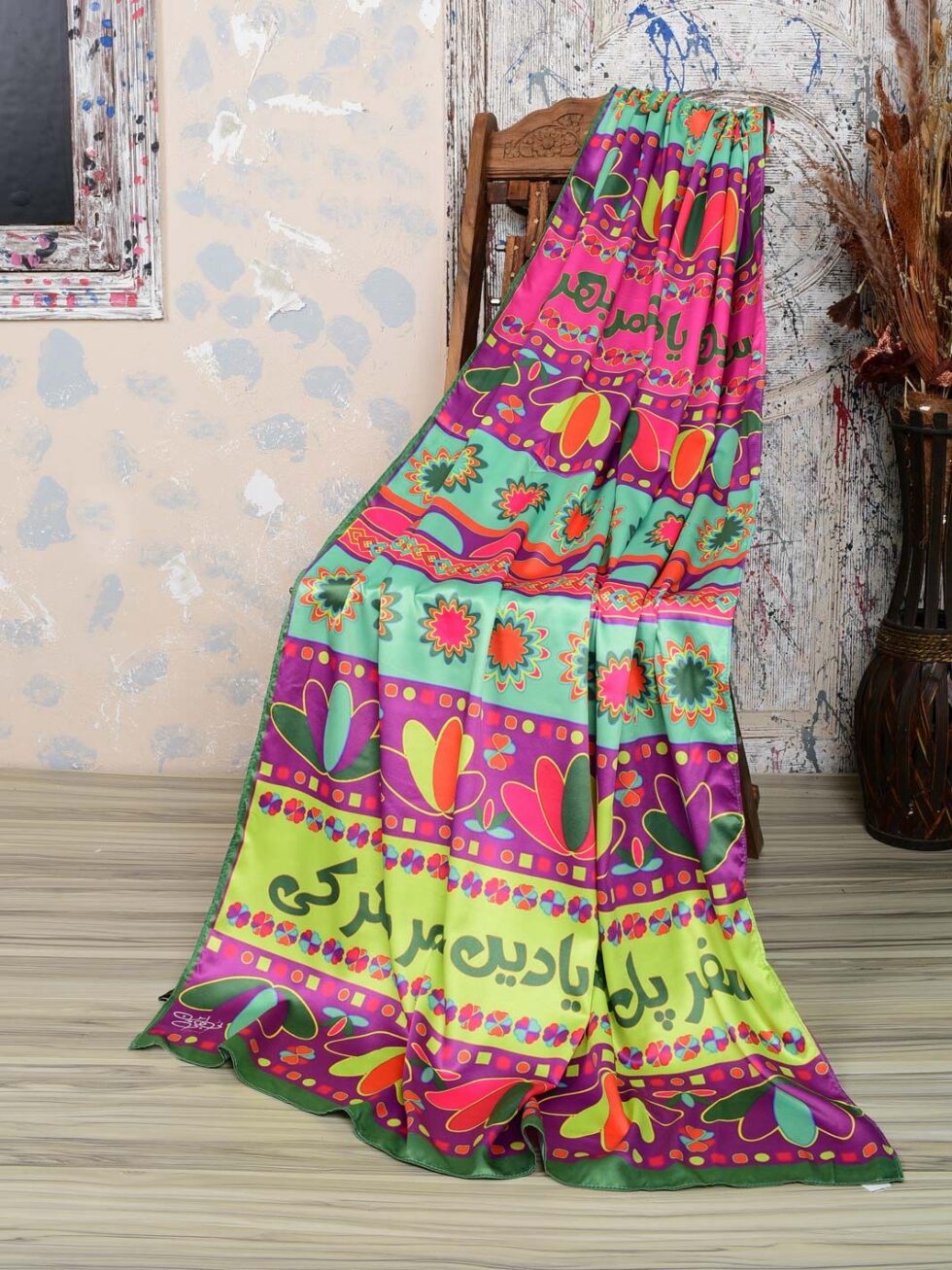 • Design: A vivid multicolor composition featuring truck art-inspired floral motifs and bold Urdu calligraphy